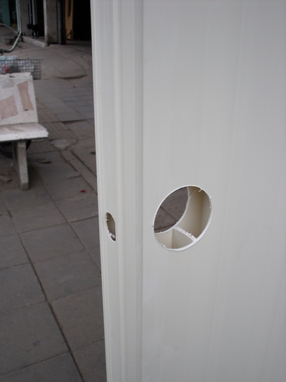 ประตูpvc ทึบล้วนเจาะลูกบิด โครงสร้างภายในผลิตแบบอินเตอร์ล็อคคือ ผลิตโดยนำชิ้นงานpvcกว้างประมาณ10ซม.มาเรียงต่อกันโดยการเข้าลิ้นเหมือนไม้พื้น จึงทำให้ประตูมีความแข็งแรงและคงทนมากกว่าปกติ