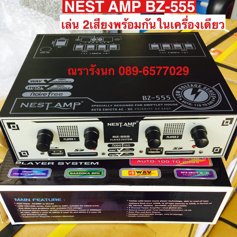 NEST AMP BZ-555 เครื่องเสียงคุณภาพสูงสำหรับบ้านนกแอ่น มีคุณสมบัติเด่น คือ สามารถเล่นเสียง 2 เสียงพร้อมกันในเครื่องเดียว แยกระดับความดังของเสียงอิสระ 4 ช่อง เหมาะสำหรับการเปิดเสียงแยกกันในลำโพง 2 ชุด เช่น ลำโพงนอก 1 เสียง และลำโพงนำ 1 เสียง หรือในหลายบ้านที่มีลำโพงดึงนกไกล BAZOOKA และลำโพงเรียกนกรอบทิศทาง ก็สามารถใช้เสียงเรียกที่แตกต่างกันได้ เหมาะกับบ้านนกทุกขนาด ช่วยในการดึงนกนอนได้เป็นอย่างดี