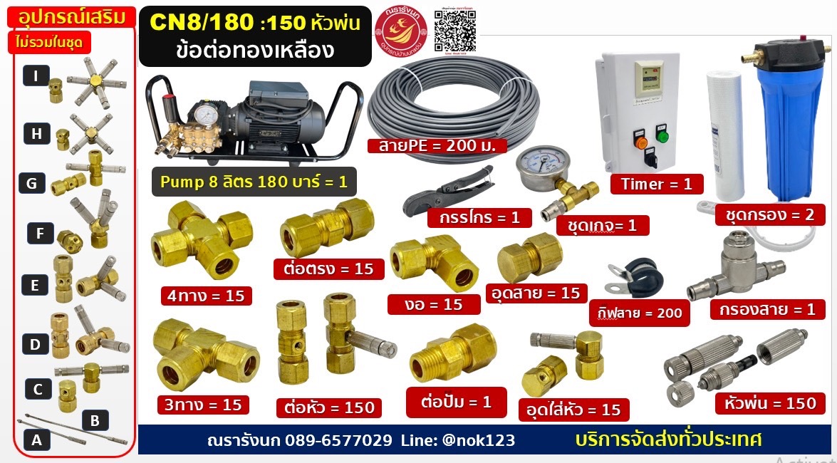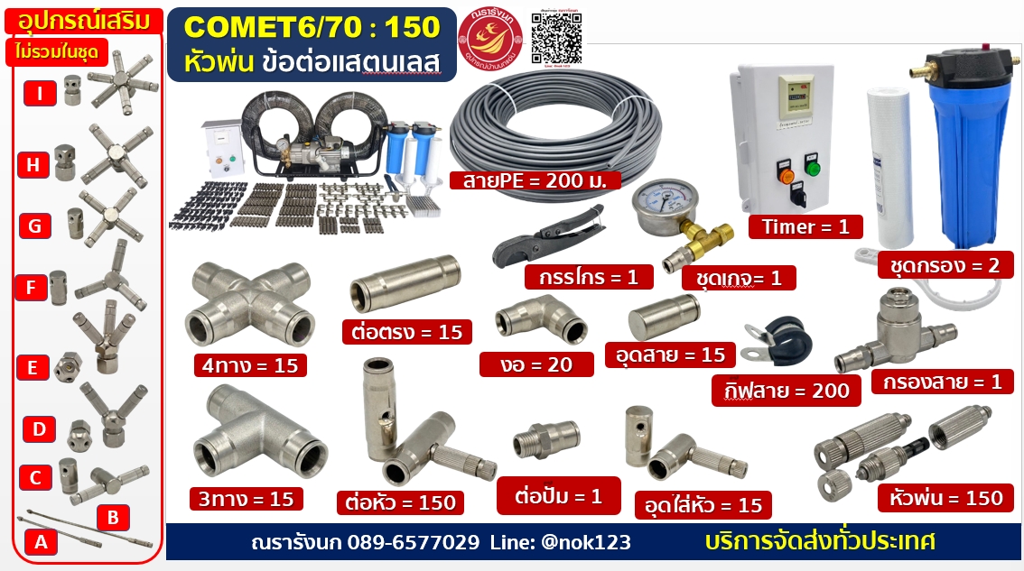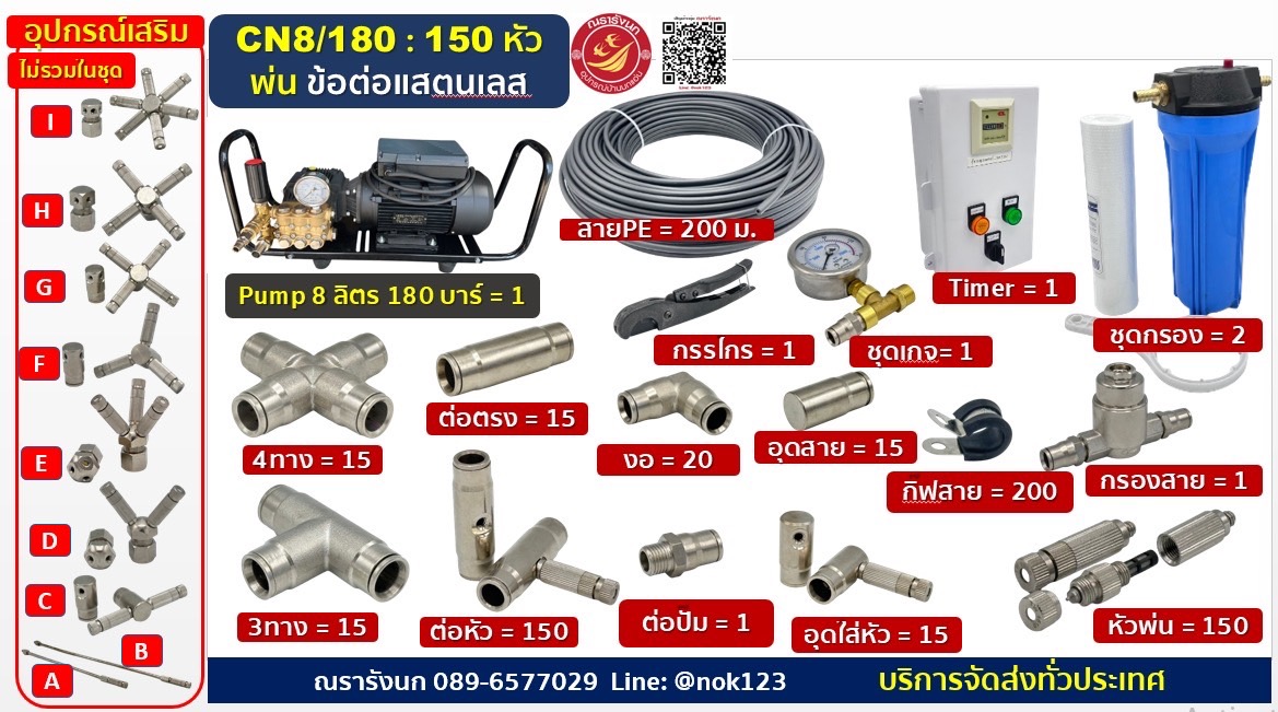 ชุดพ่นหมอกแรงดันสูง150หัวพ่น ข้อต่อแสตนเลส ปั๊มCOMETอิตาลี