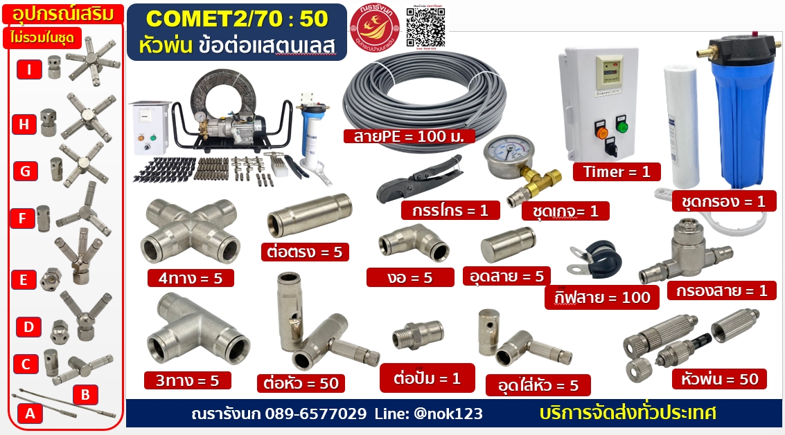 ชุดพ่นหมอกแรงดันสูง 50 หัวพ่น ข้อต่อแสตนเลส ปั๊มCOMETอิตาลี