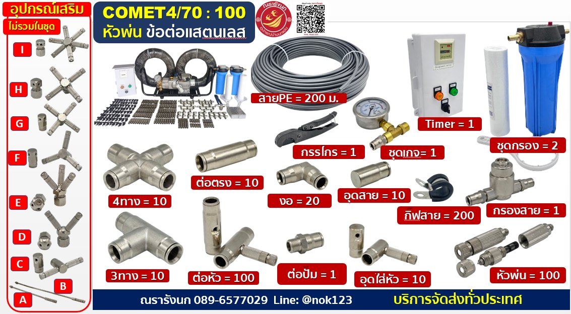 ชุดพ่นหมอกแรงดันสูง100หัวพ่น ข้อต่อแสตนเลส ปั๊มCOMETอิตาลี